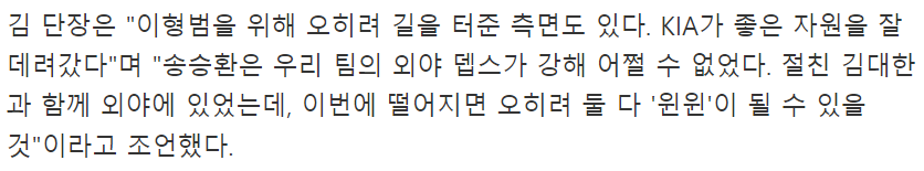 그리고 기억이 나는 건 2024년 2차 드래프트로 팀을 떠난 송승환 선수. 김태룡 단장의 인터뷰에 열이 뻗쳤던 게,