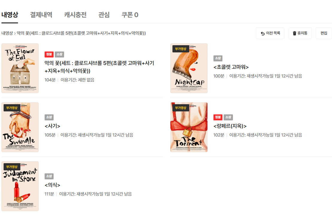 그렇게 기시감의 원인을 찾고 보니 속은 시원한데 본의 아니게 끌로드 샤브롤 감독의 영화 '의식'도 궁금해지기 시작- 구매할 수 있는 플랫폼이 두 곳 있었는데 '왓챠'와 '시리즈온' 중 '시리즈온'에서 구입하기로 하고 보니 감독의 연출작 중 영화 '의식'을 포함한 다섯 편이 묶음으로 10% 할인/판매(?)하고 있더라.