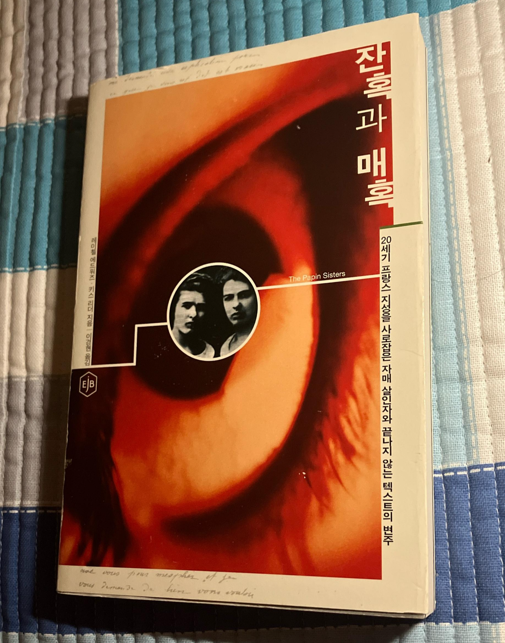 1930년대 당시 파팽 자매가 저지른 살인 사건에 계급이나 성별 등에 따른 집단들이 사건을 어떻게 편취하며 받아들이고 소비했는지, 그렇게 당시 각자 계급 등을 대표(?)하는 철학자, 작가 등의 창작에 의해 영화나 연극 등에 어떤 내용으로 실렸는지, 나아가 저 사건의 어떤 면이 당시, 그리고 후대의 지식인 및 창작자들에게 영감을 주는 것인지-를 논하는데 생각보다 재미있게 읽었던 기억의, '잔혹과 매혹'이라는 제목의 책 되시겠다.