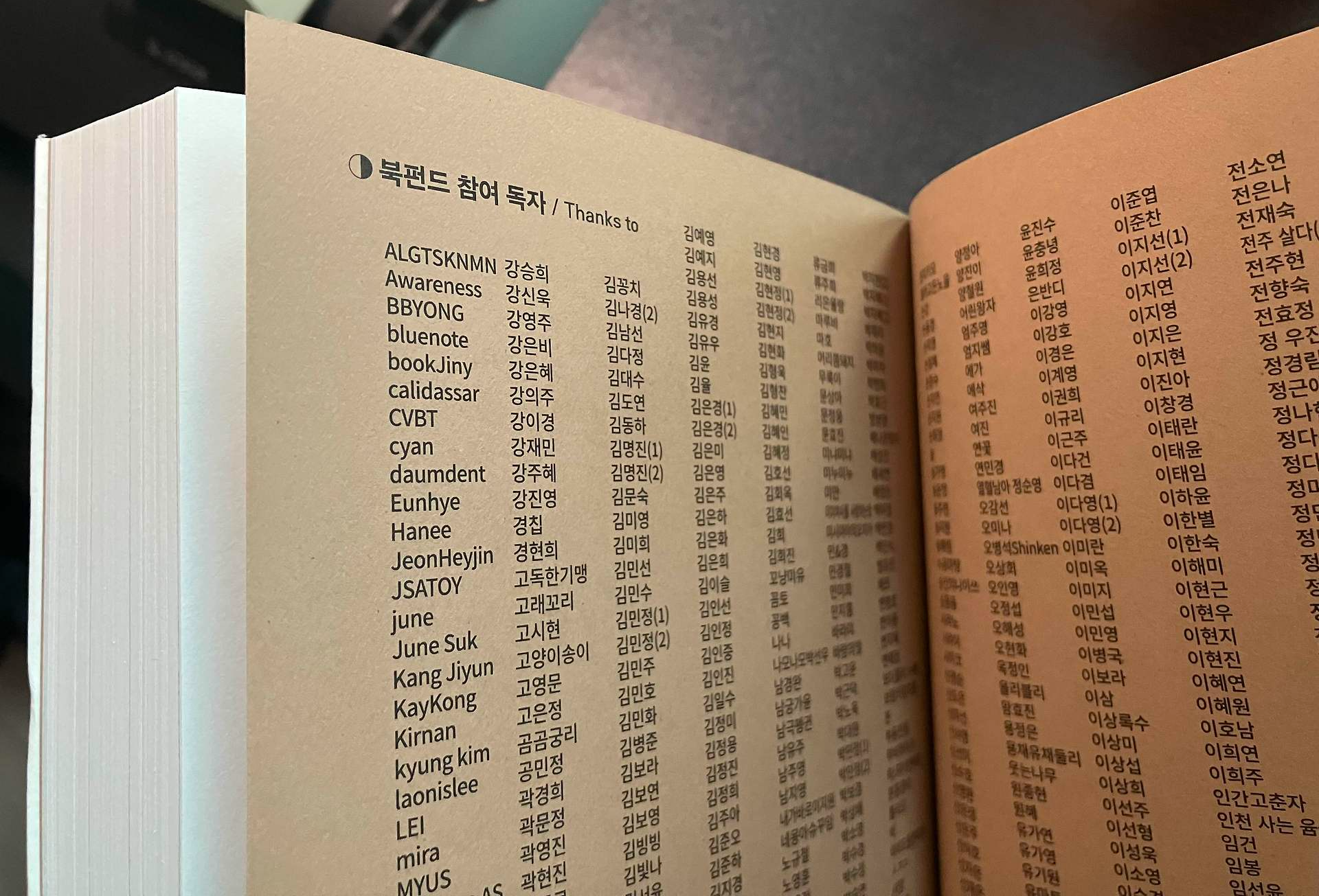 이건 '청과 부동명왕' 뒷페이지에 기재된 '북펀드 참여 독자'들이다. 다 기재되는 건 아니고 아마 선택사항이었던 것 같다-는 즉, 내 이름이 있을 수도 있고 없을 수도 있다.