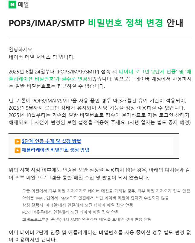 네이버 메일) POP3/IMAP/SMTP 2단계 인증